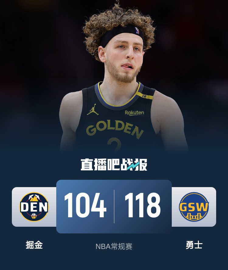 首节对决双方打出疯狂攻势双方命中率一度超过六成,节中双方合计8个回合全部转化成得分互不相让,掘金疯狂包夹也给勇士其他球员机会,不过掘金的攻势持续一整节并在末段轮换阶段送上16-8的攻势拉开10分领先;次节掘金状态突然回落,首节爆砍44分的他们次节仅得16分,库里则在第二节砍下12分引领勇士打出净胜16分的单节进攻直接反超6分进入下半场。休息归来双方持续拉锯,第三节末段波杰姆斯基和卢尼连续抢分送上9-3的攻势一举拉开两位数分差,这波攻势贯穿之后的第四节,勇士拿到两位数优势后一路维持到最后。最终,勇士主场击退掘金迎来5连胜,同时也终结了对阵掘金的9连败。