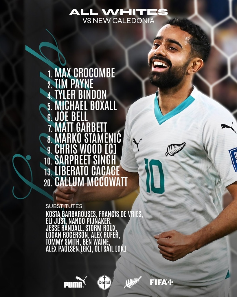 新西兰首发:1-马克斯-克罗科姆、2-蒂姆-佩恩、4-泰勒-宾顿、5-米切尔-伯克萨尔、6-乔-贝尔、7-马修-加伯特、8-马科-斯特梅克、9-克里斯-伍德、10-萨普里特-辛格、13-里贝拉托-卡卡塞、20-卡勒姆-麦考瓦特