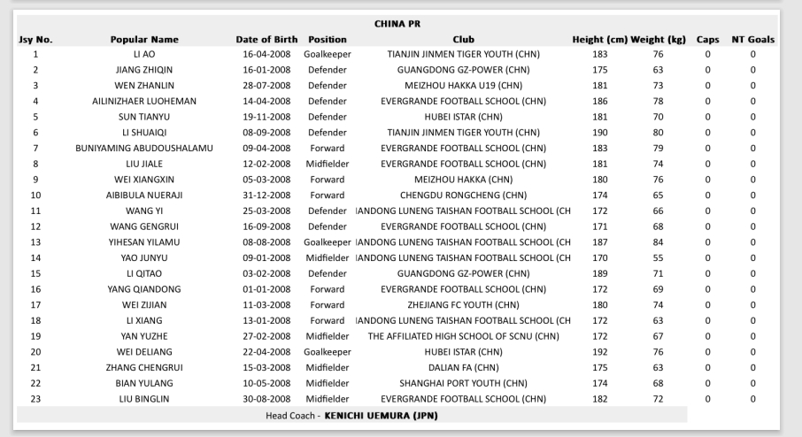 03月29日讯 亚足联官方公布U17亚洲杯各队23人名单,中国队名单中艾比布拉领衔,魏祥鑫、布尼亚明在列。这支U17国足由上村健一挂帅,球队近期共踢了4场热身赛,均失利。