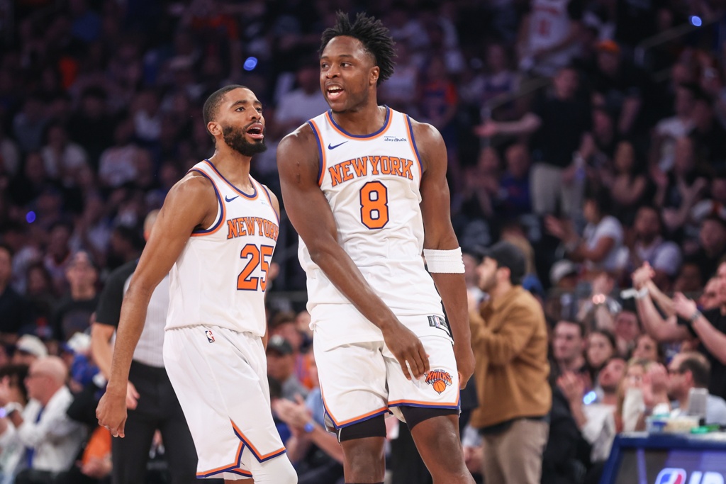 尼克斯决胜时刻唯一战术就是把球交给布伦森,他G1第四节和加时合砍11分1三分助攻,G2末节贡献9分1三分助攻——单打强势硬解冠军防守大锁霍勒迪,打到包夹为止,团队转移球,阿努诺比和布里奇斯这两战都命中了关键三分,尼克斯阵地战进攻硬解的开发源头答案无疑就是布伦森。