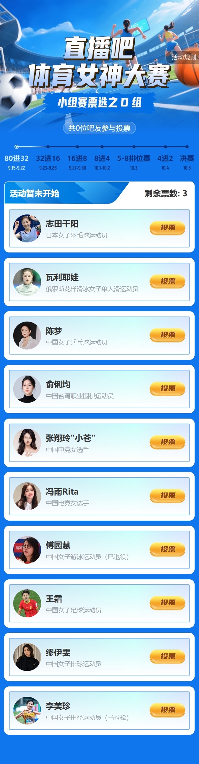 小组赛期间,您可以为所有小组的任何一位您喜爱的女神投票。