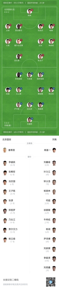 04月25日讯 今晚19:35中超第9轮,北京国安vs河南。赛前首发阵容已经公布。