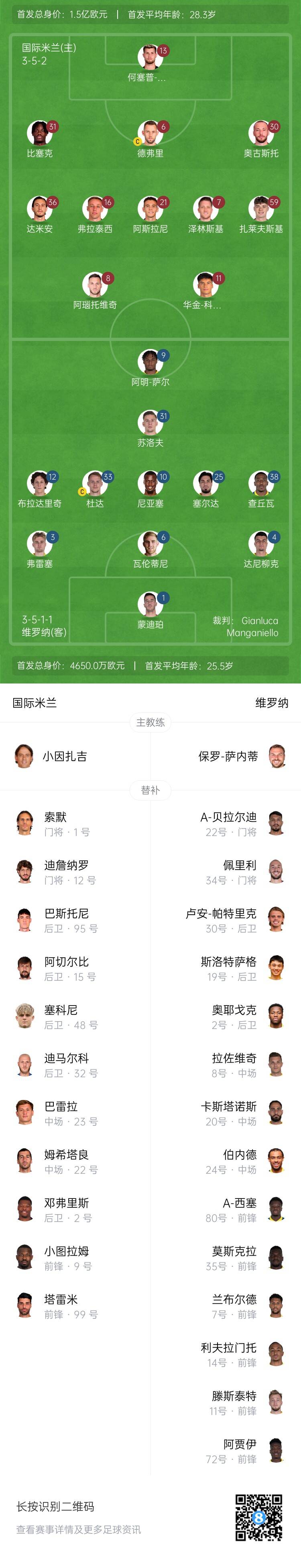 国米首发:13-何塞普-马丁内斯、31-比塞克、6-德弗里、30-奥古斯托、36-达米安、16-弗拉泰西、21-阿斯拉尼、7-泽林斯基、59-扎莱夫斯基、8-阿瑙托维奇、11-科雷亚