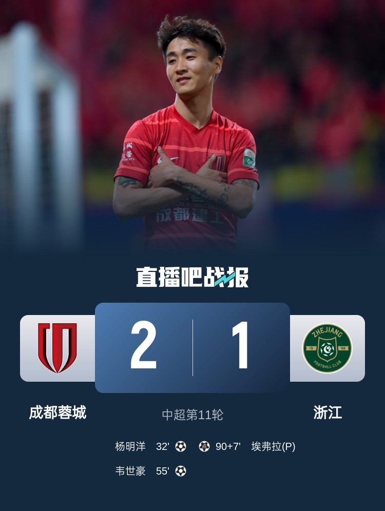 先赛3分领跑!蓉城2-1浙江取4连胜 韦世豪联赛第4球杨明洋处子球