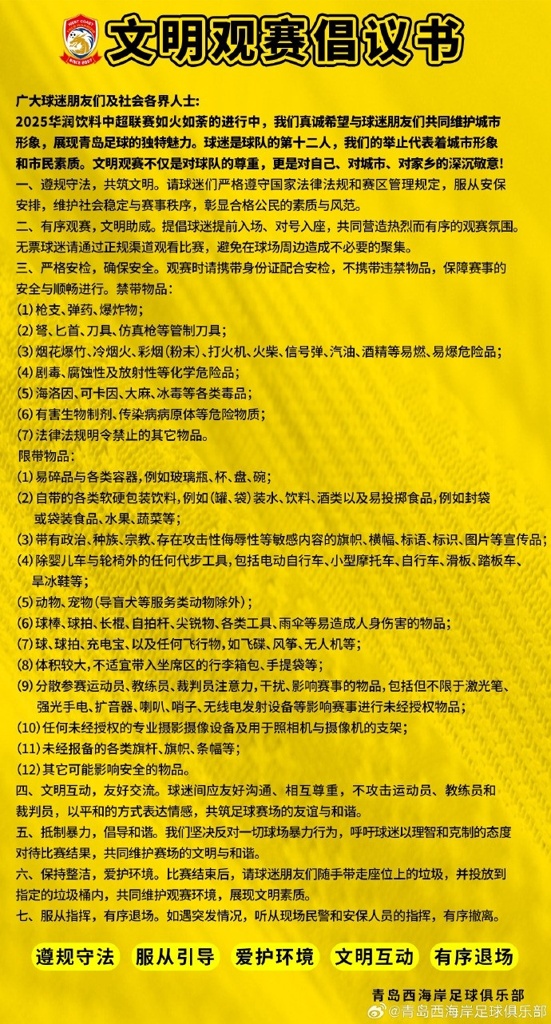 俱乐部真诚呼吁球迷朋友们共同维护城市形象,展现青岛足球的独特魅力。球迷是球队的第十二人,我们的举止代表着城市形象和市民素质。文明观赛不仅是对球队的尊重,更是对自己、对城市、对家乡的深沉敬意!球迷间应友好沟通、相互尊重,不攻击运动员、教练员和裁判员,以平和的方式表达情感,共筑足球赛场的友谊与和谐!