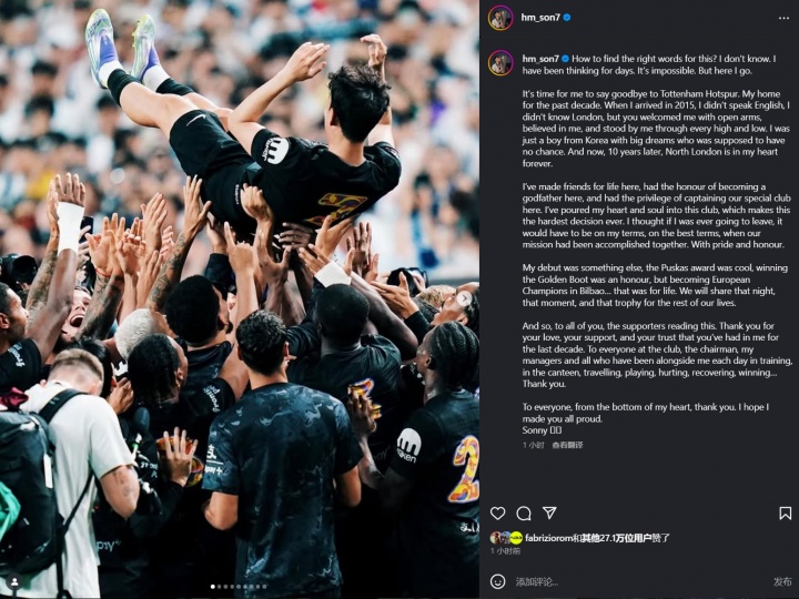 “是时候向托特纳姆热刺告别了。我过去十年的家。当我在2015年抵达时,我不会说英语,我不了解伦敦,但你们张开双臂欢迎我,相信我,并在每一次高峰和低谷中都支持着我。我那时只是一个来自韩国、怀揣远大梦想、被认为毫无机会的男孩。而现在,十年后,北伦敦将永远在我心中。”