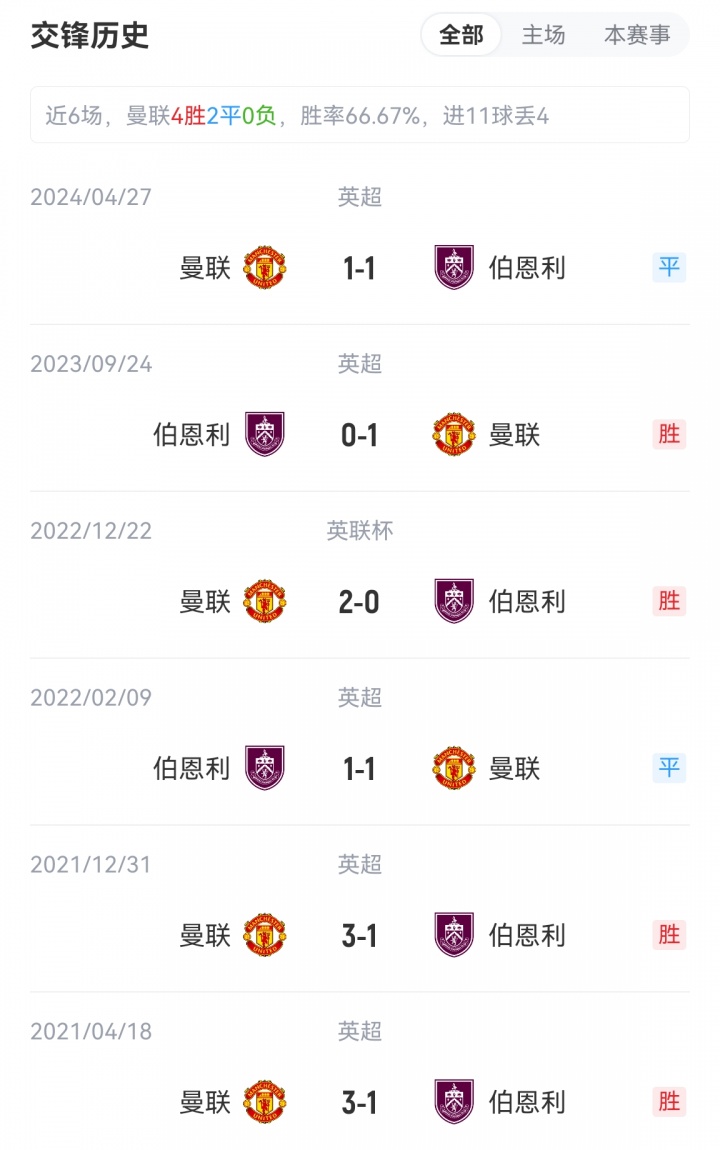 曼联在最近 25 场主场对阵伯恩利的比赛中仅输过一场(15 胜 9 平)。