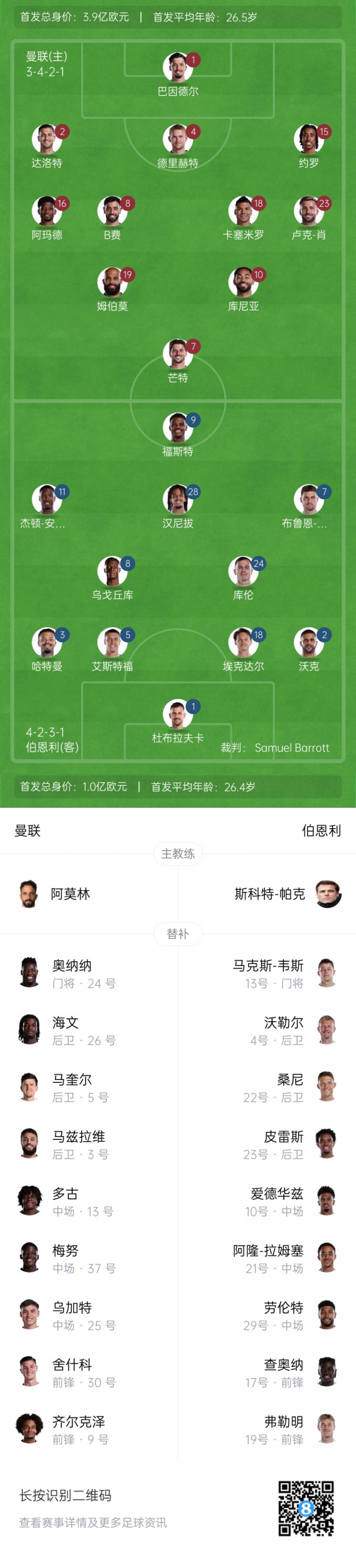曼联首发:1-巴因德尔、4-德里赫特、15-约罗、23-卢克-肖、2-达洛特、8-B费、16-阿玛德、18-卡塞米罗、7-芒特、10-库尼亚、19-姆伯莫