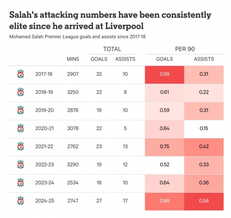 4月13日讯 萨拉赫已经与利物浦续约,The Athletic统计了萨拉赫加盟以来在英超的数据,这位埃及人有6个赛季完成两双数据。