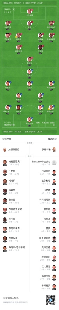 04月13日讯 北京时间18:30,亚特兰大主场对阵博洛尼亚。赛前,双方公布首发名单。